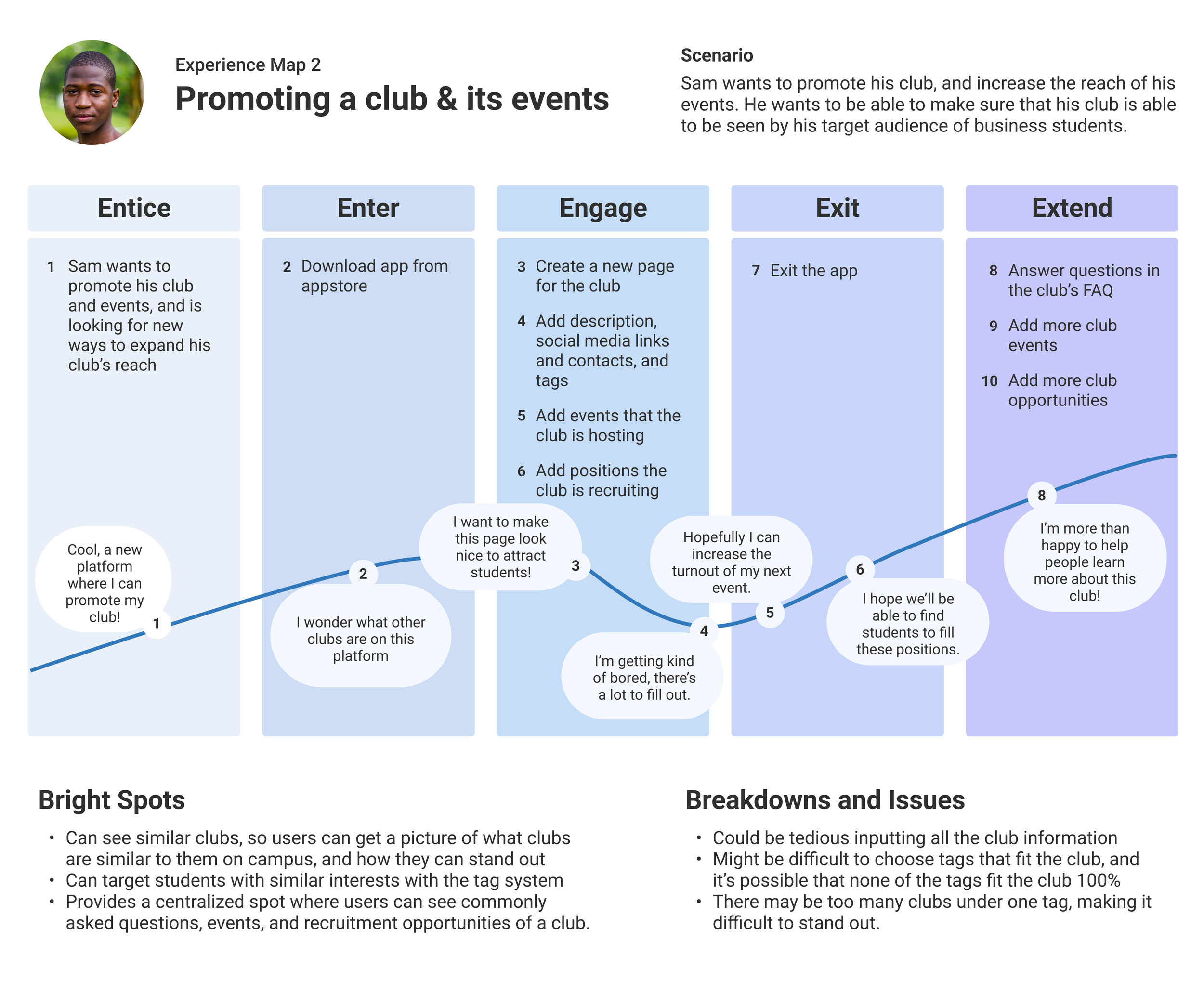 The next iterations would focus more on the “promoter” side of the app, focusing more on the journey of my persona “Senior Sam”. The current iteration is catered more toward the needs of students who are looking to get more involved (such as Studious Sofia), however, the other half of the user base would be clubs looking to promote their opportunities and events. Some examples: