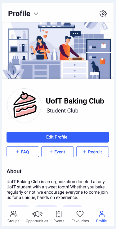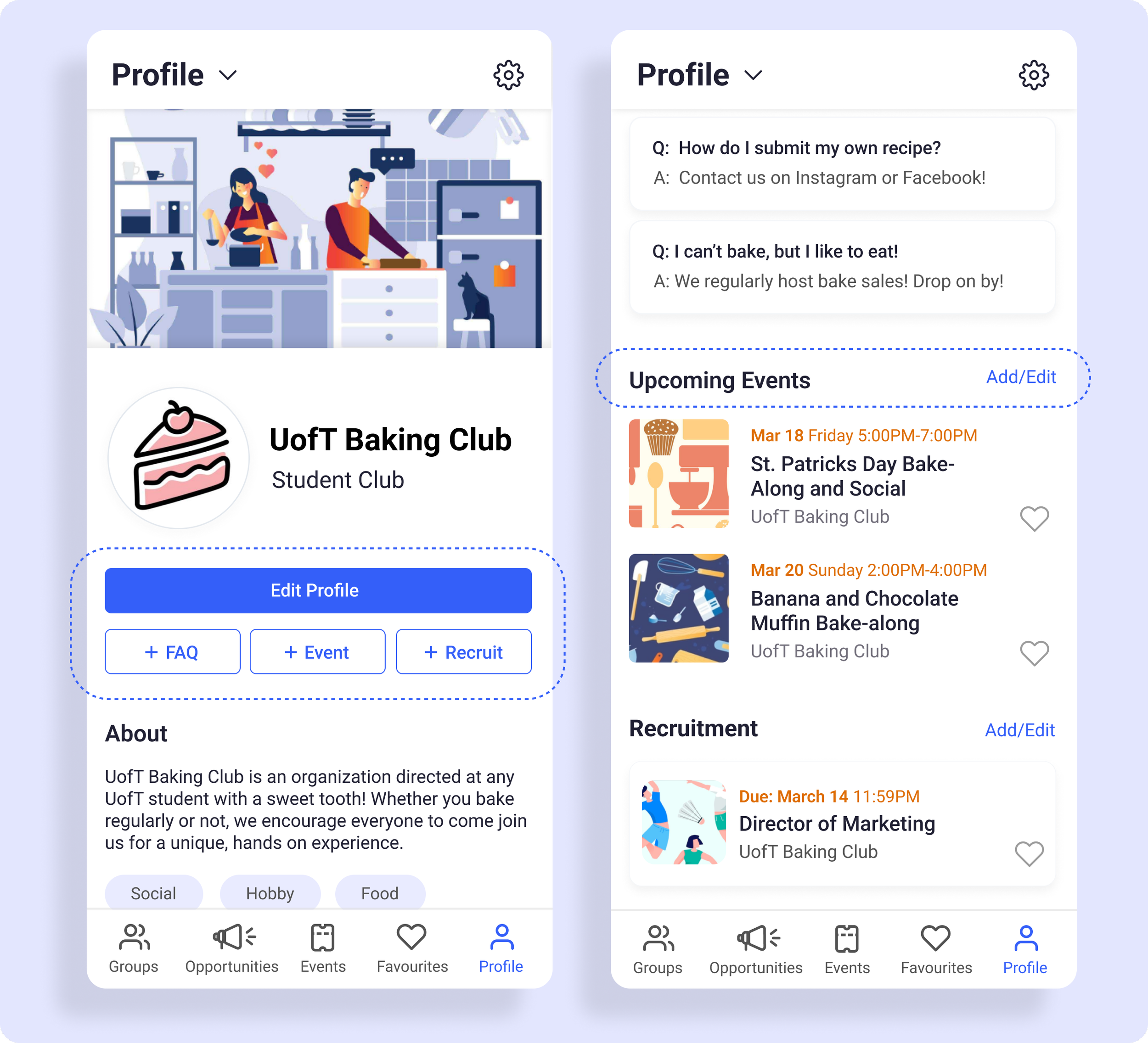 In the Group Admin Profile (Fig. 9), groups can add/edit FAQs, upcoming events, as well as recruitment posts.