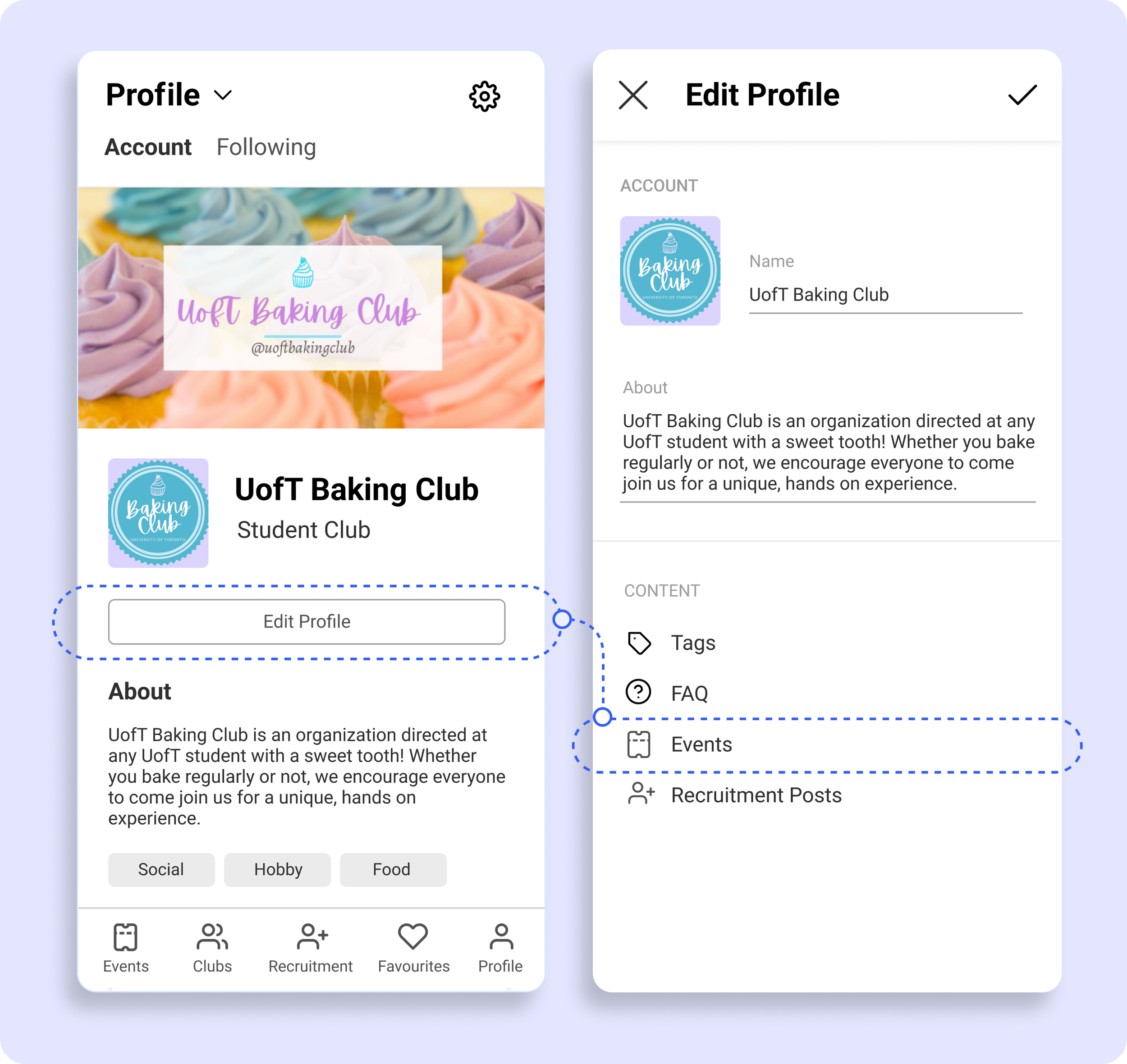 As the functionality was under “edit profile”, this usually implies that it would lead the user to settings that would have to do with editing the name and description of the club. Additionally, many users didn’t notice the button, so it needed to stand out more.