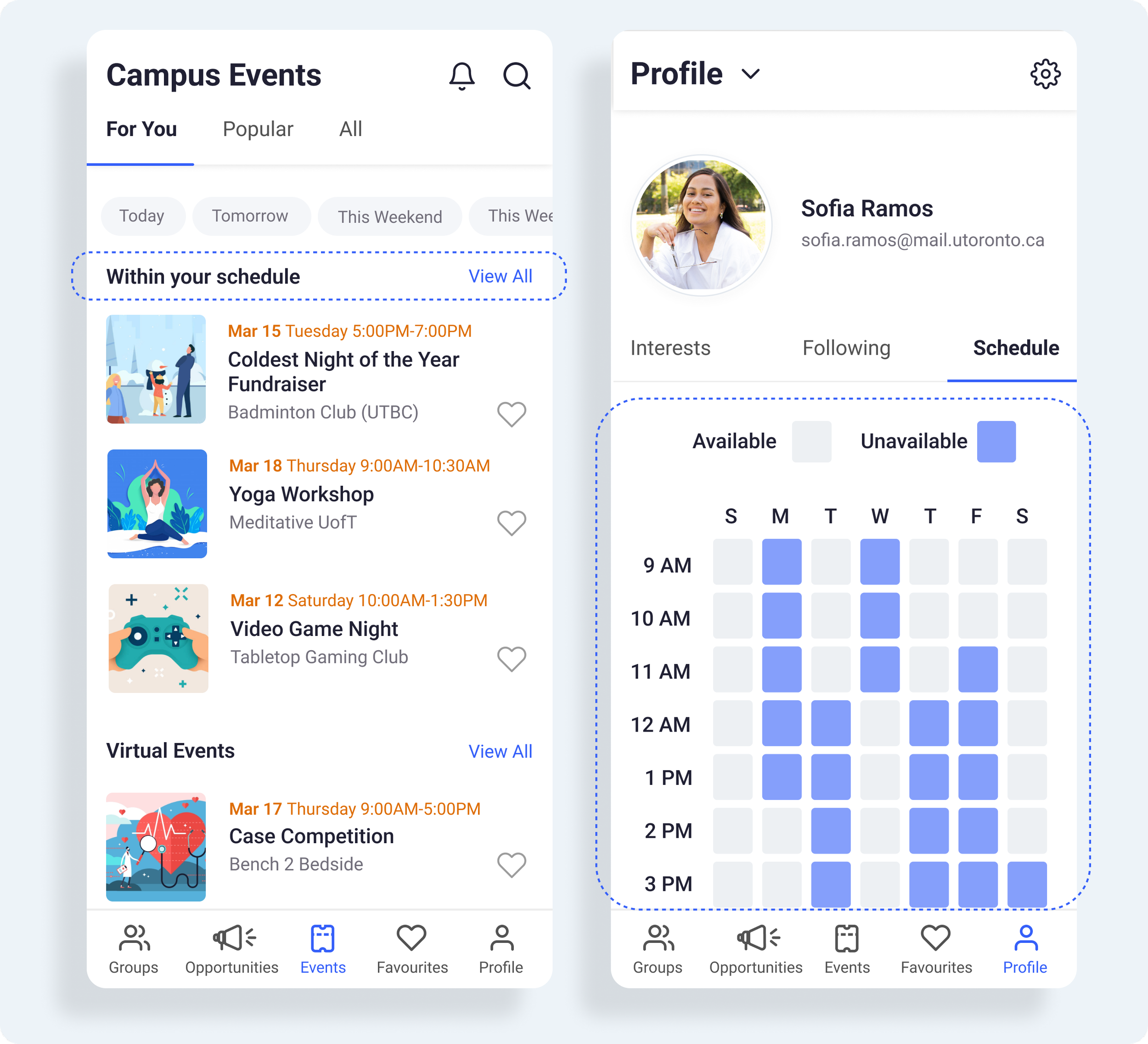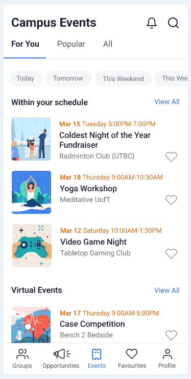 The Campus Events (Fig. 5) page is a centralized space where users can view events that fit within their schedule, recommended events based on their interests, popular events, and all of the events happening on campus.