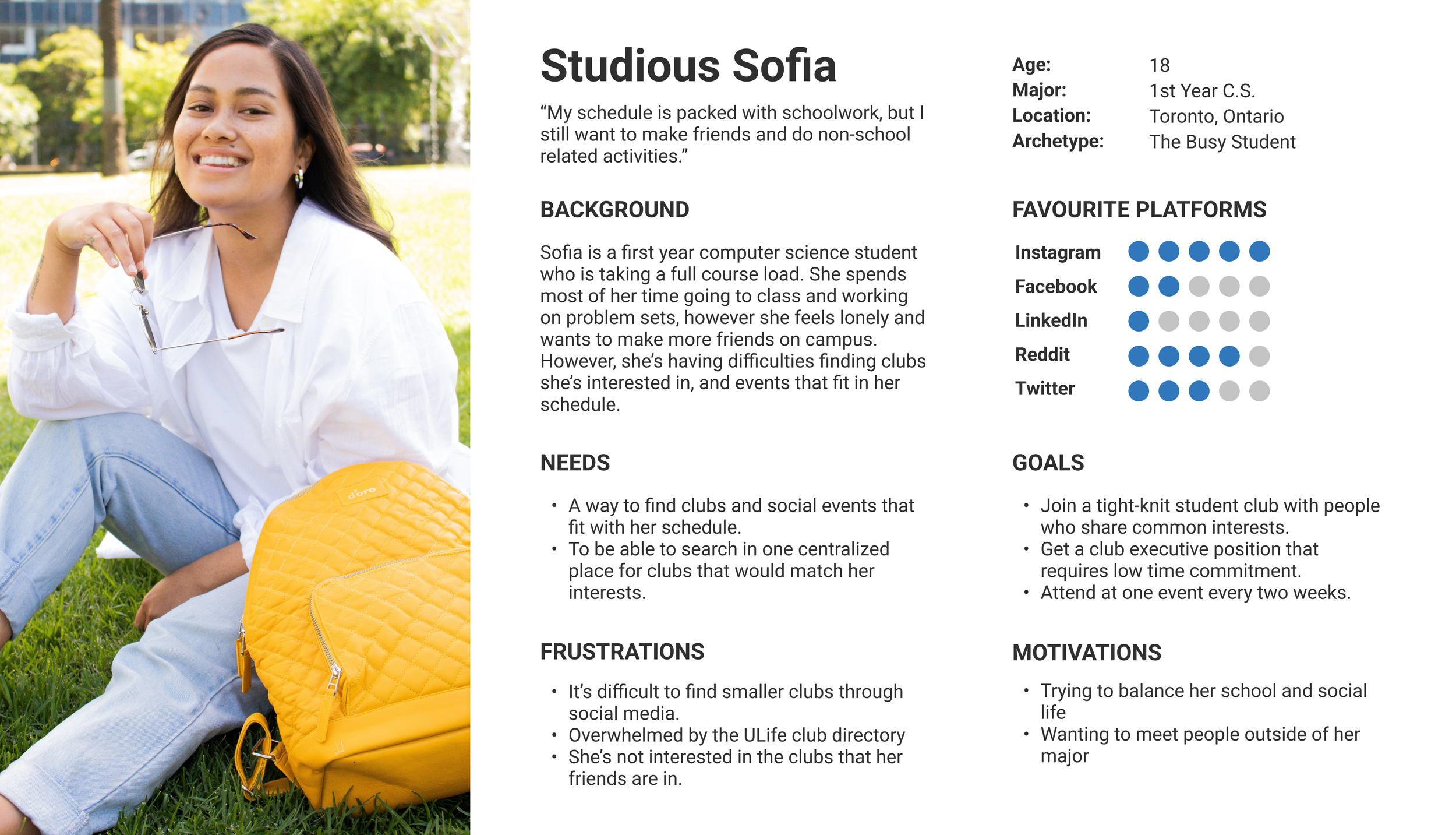 Research: Students expressed frustrations with contacting inactive clubs that they’ve found on ULife, and missing out on events because they’ve only heard about them after they’ve passed.