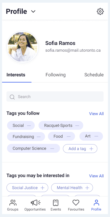 The Student Profile (Fig. 8) is where the user can edit the tags that they’re interested in, view the student’s groups that they follow, and fill in their schedule to get tailored results in the events page.