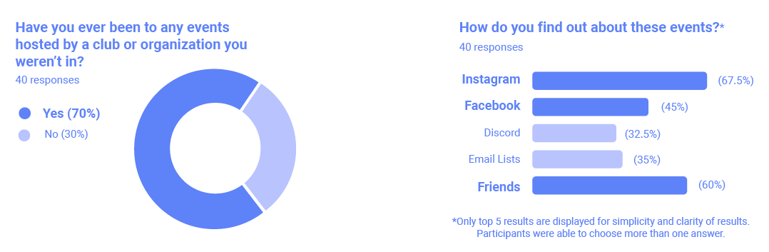 From surveying 40 students, 70% of participants have attended an event hosted by a club or organization that they weren’t a part of. The most popular method of discovering these events is through Instagram (67.5%), Friends (60%) and Facebook (40%).