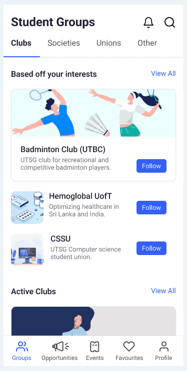 The Student Groups page (Fig. 1) has information on clubs, student societies, program/course unions, and other groups on campus. Students are able to follow the groups that they’re interested in, stay up to date on their activities, and get notifications for when there are new events or recruitment opportunities.
