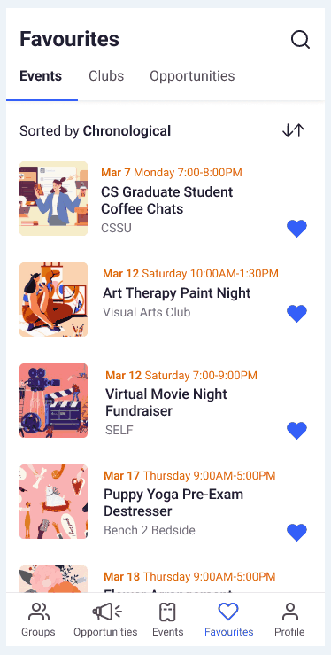 Favourites (Fig. 7) has all of the users’ saved events, clubs, and opportunities.