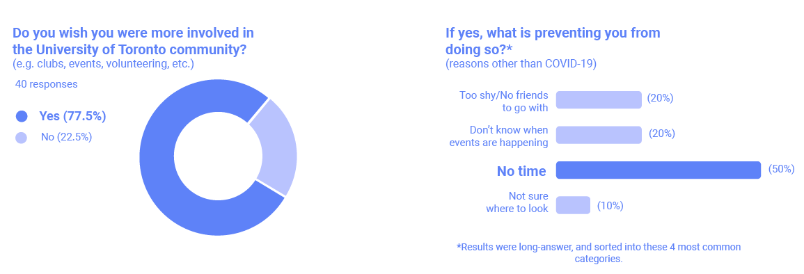 After surveying 40 university students, 77.5% wished they were more involved in the UofT community, and the most common barrier they faced from doing so was lack of time (50% of correspondents).